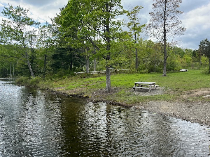 Waterfront Hilltop primitive cabin over 1000′ from dirt road with bunk bed and sleeping loft. Comfortably sleeps 4 but lots of space on porch and plenty of room to pitch a tent if extra sleeping area was desired. There is an outhouse near the cabin. Large boulder fire pit, park style grill and picnic table for your enjoyment.