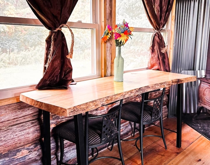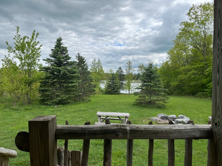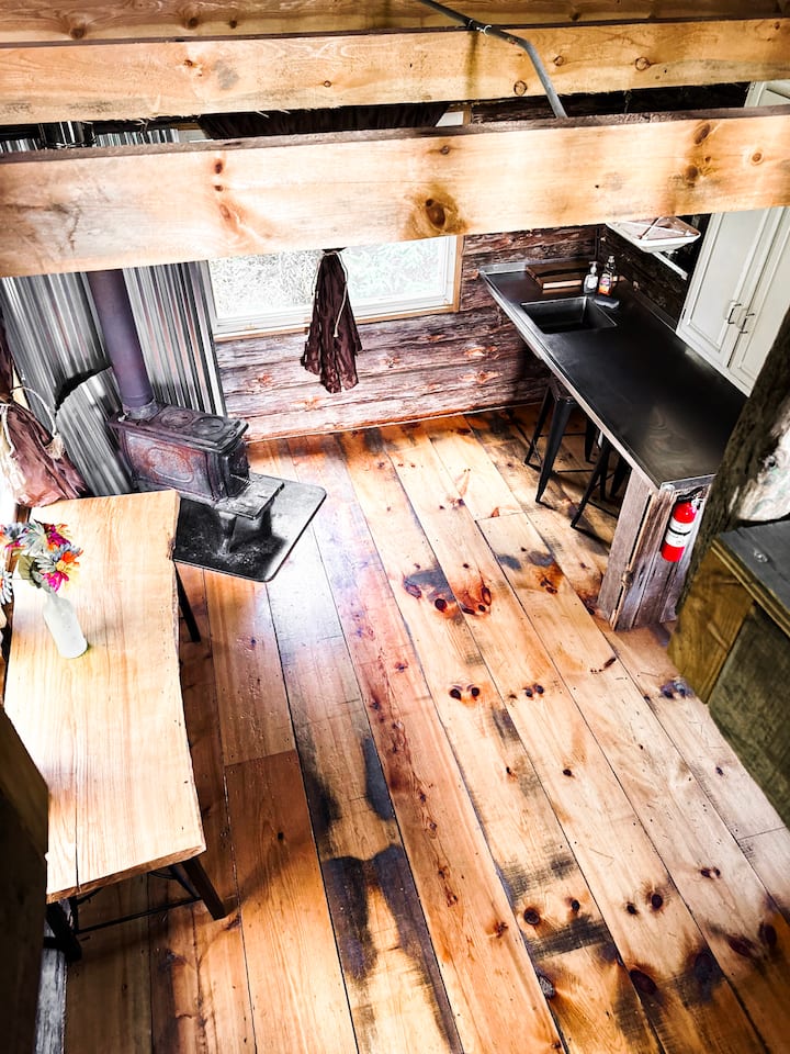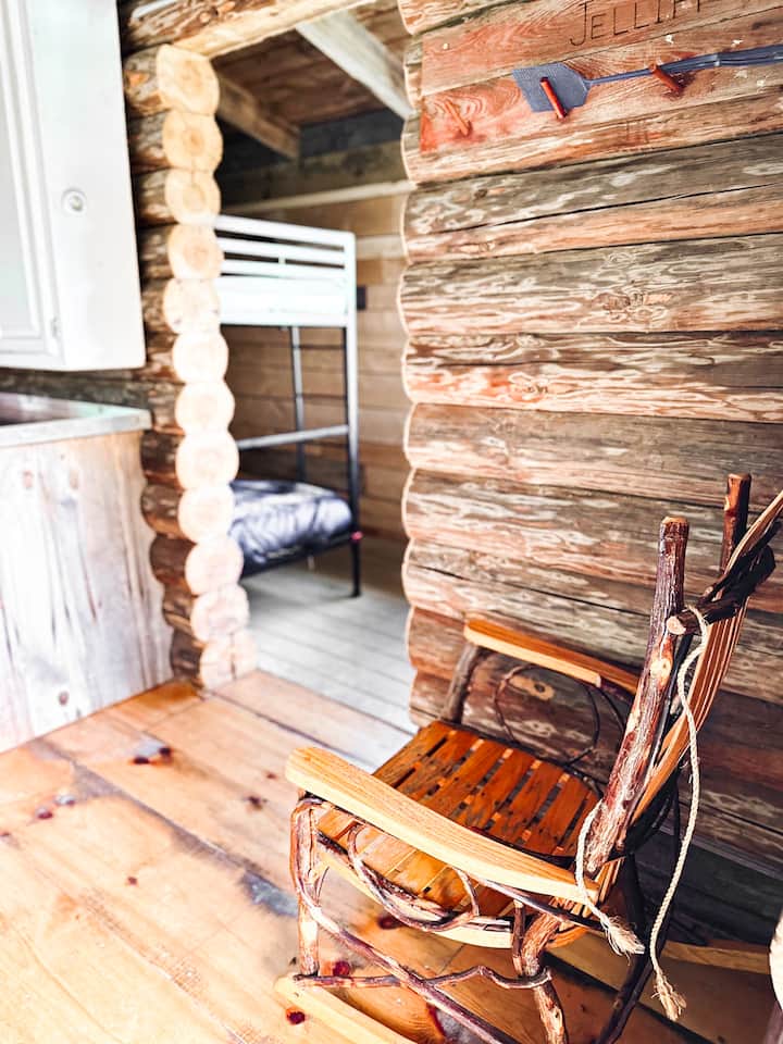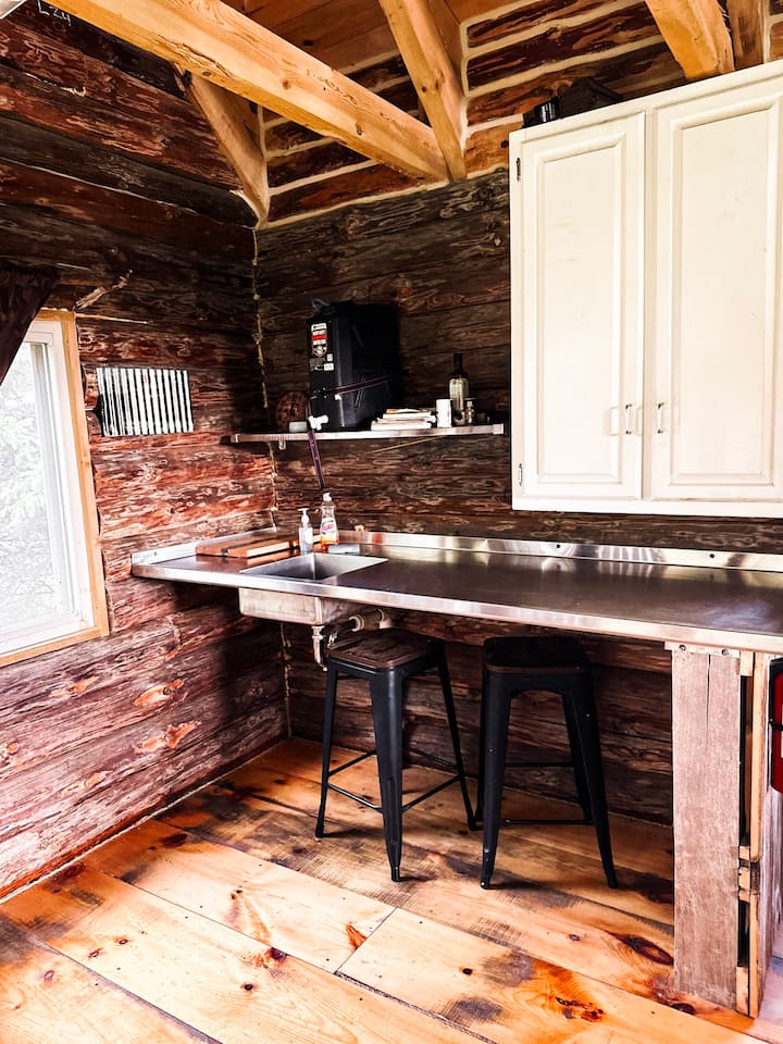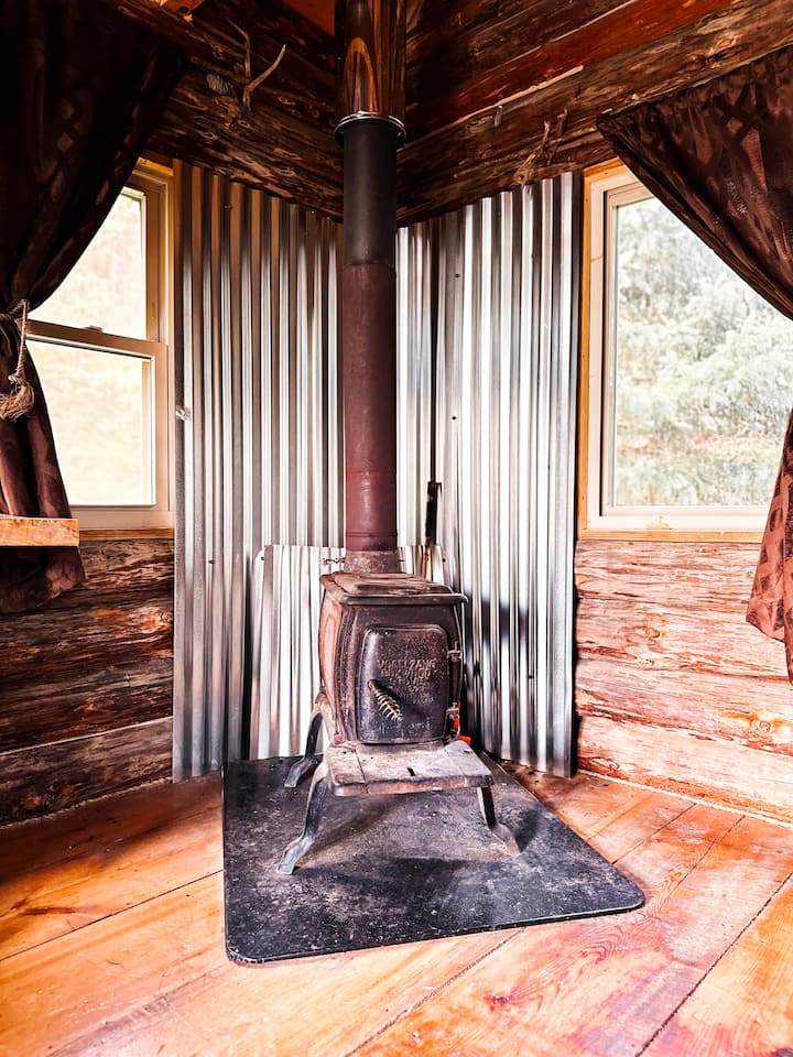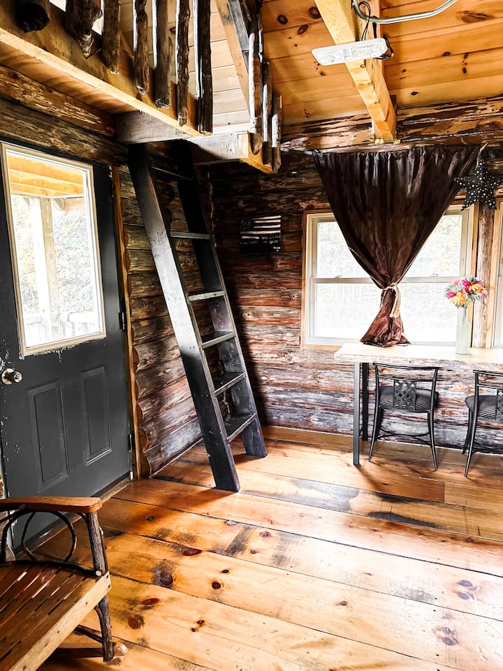 Tiny Rustic log cabin with a large porch. No electricity or water but there is solar lighting inside cabin, loft and porch. There is a wood stove for heating during the cold months and an outhouse located behind the cabin.