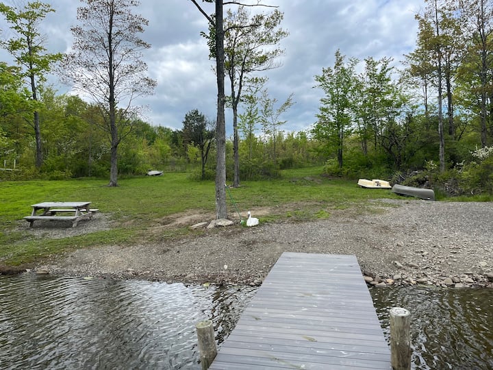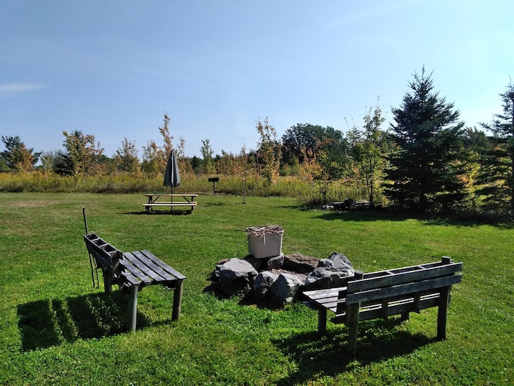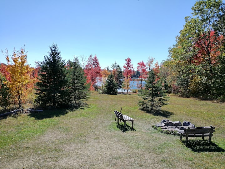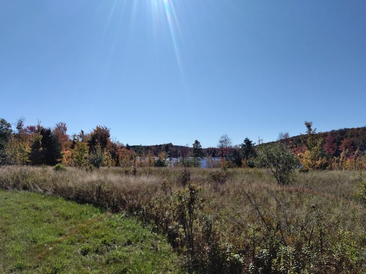 Wild apple trees, blueberries and wildlife all around. 50 acre lake for fishing or paddling and trails for walking.