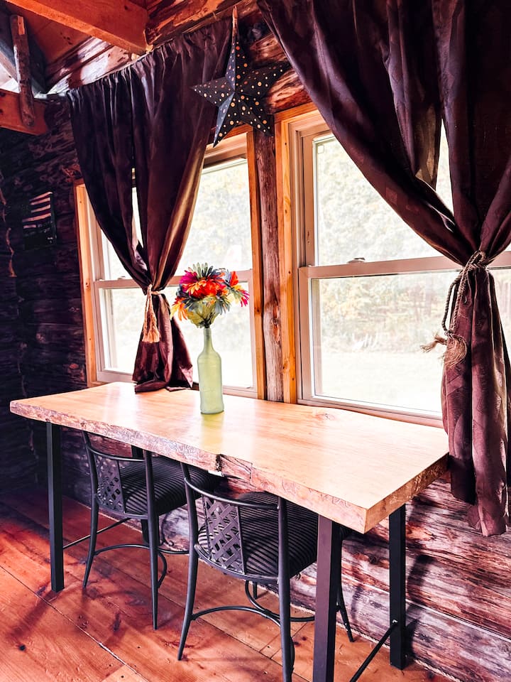 Small table and 2 chairs inside cabin and a wooden rocking chair that can be used inside or on the porch to enjoy the lake view and nature.