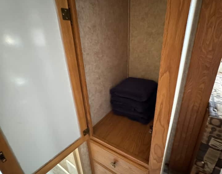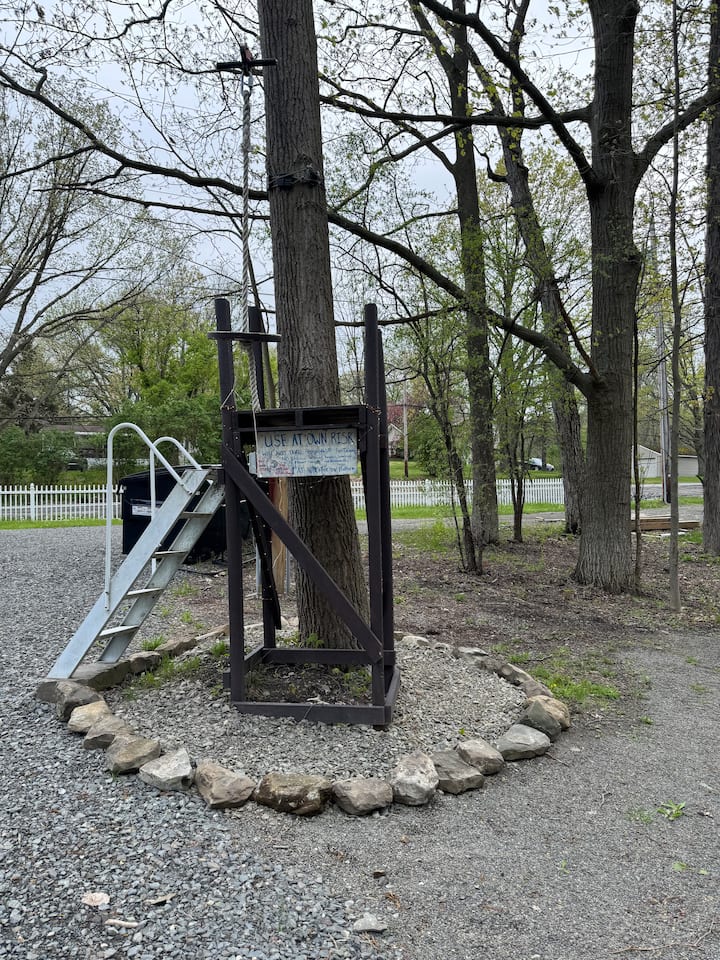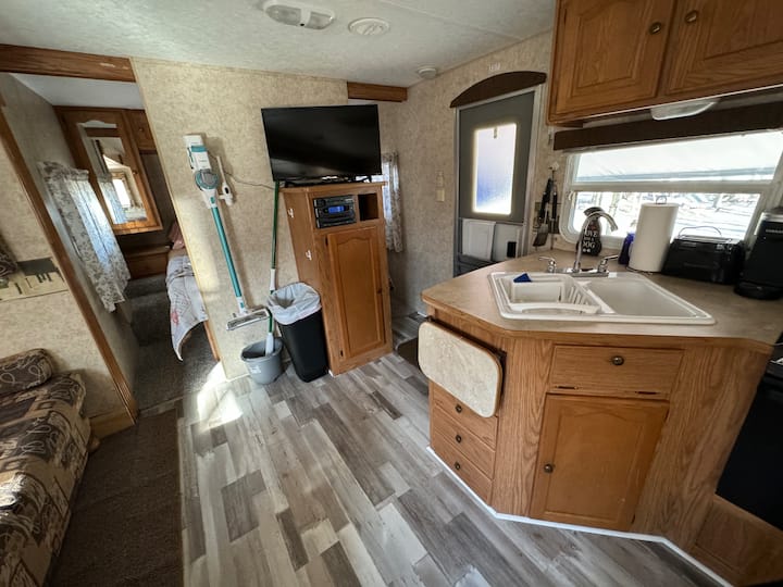 Welcome to a unique stay in one of our RV’s sleeps 5 comfortably. A welcome basket… Private fire pit. Shared with other campers-Outdoor movie theater, pool table, zip line, foosball, air hockey, volleyball. A 2 min. drive to the ❤️ of Watkins & attractions- I have 4 campers in total, not to be moved from there spots. This is camping and not a 5 star hotel. There will be bugs! Toilet has been replaced with full hook up regular toilet to eliminate holding tank odors!