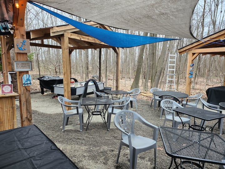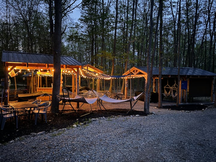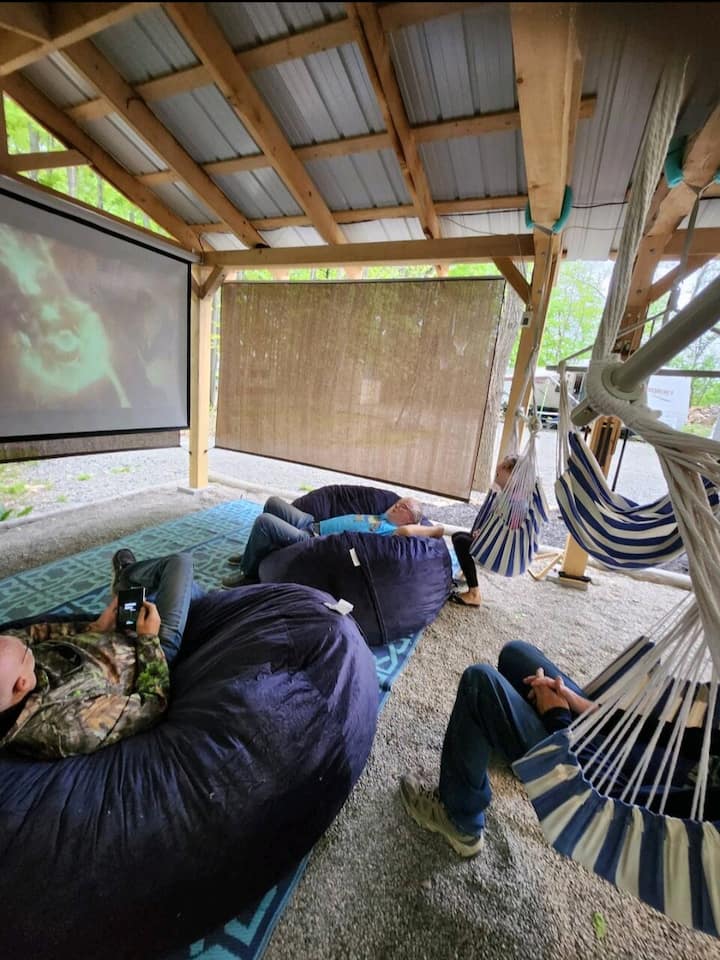 A 4 person personal hot tub, along with shared amenities -outdoor movie theater, zip line pool table, volleyball, foosball, air hockey and more makes this a unique stay!